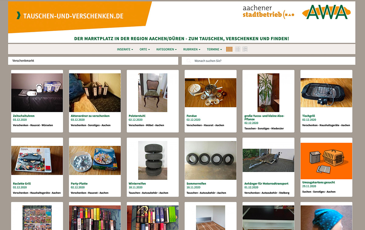 Hier können Sie Gegenstände online tauschen und verschenken sowie Gesuche selbst eintragen und löschen. Einzige Regel: Es werden keine kommerziellen Interessen verfolgt und Gegenstände und Produkte werden nicht zum Kauf angeboten!