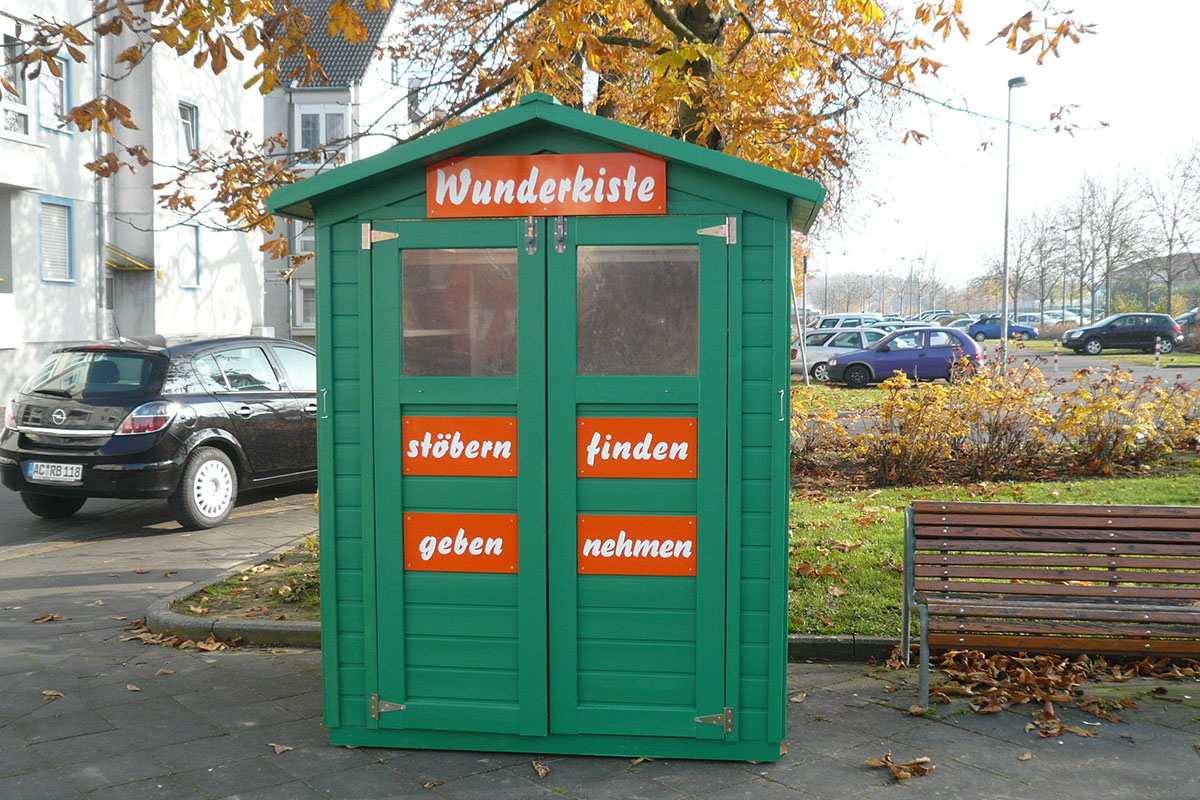 In den grünen, wetterfesten Gartenhäuschen kann man nach Herzenslust stöbern. Jeder kann brauchbare und saubere Gegenstände dort hineinlegen oder sich ohne Gegenleistung etwas aussuchen. Wie jede gute Idee verbindet die Wunderkiste gleich mehrere positive Aspekte: Sie schont die Umwelt, sie hilft besonders Menschen mit geringem Budget, sie stärkt den sozialen Zusammenhalt und bringt Leute miteinander in Kontakt.